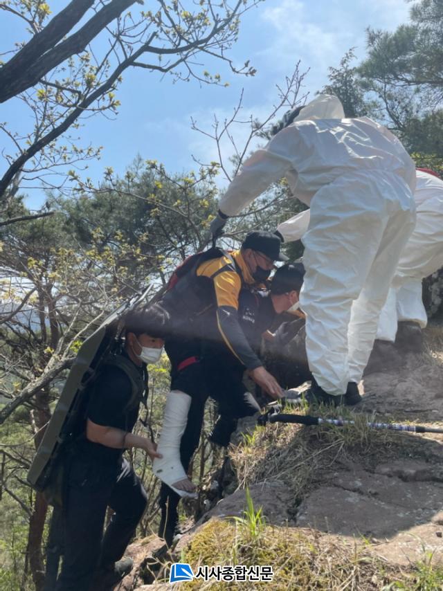 ÇöÀå¿¡ µµÂøÇÑ »ê¾Ç119±¸Á¶´ë¿ø ¹× ±¸±Þ´ë¿ø 6¸íÀº A¾¾ÀÇ ¹ß¸ñÀ» ºÎ¸ñÀ¸·Î °íÁ¤ÇÏ´Â ÀÀ±Þóġ µîÀ» ½Ç½ÃÇÑ ÈÄ È¯ÀÚ¸¦ ¾÷°í ¾ÈÀüÇÏ°Ô ±¸Á¶ÇÏ¿´´Ù.