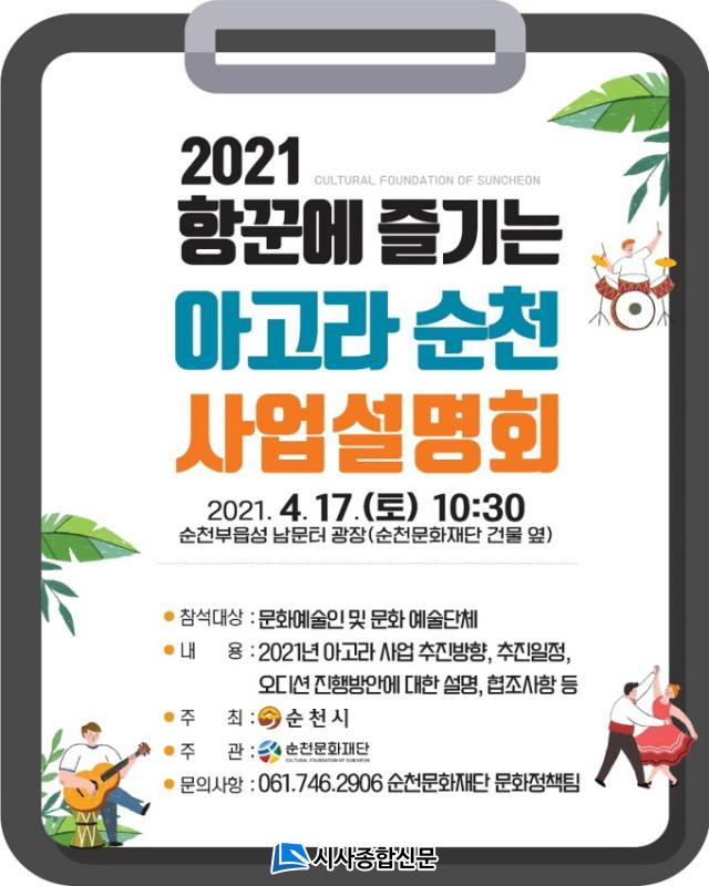 Àç´ÜÀº ¼øÃµ Áö¿ª ¹®È¿¹¼úÀÎµé ´ë»óÀ¸·Î ¡®Çײۿ¡ Áñ±â´Â ¾Æ°í¶ó ¼øÃµ¡¯ÀÇ 2021³â »ç¾÷¹æÇâ, ÃßÁøÀÏÁ¤, ¿Àµð¼Ç ¹æ½Ä µî¿¡ ´ëÇÑ ºê¸®Çΰú ±Ã±ÝÇÑ »çÇ×À» ÁúÀÇ ÀÀ´äÇÏ´Â ¹æ½ÄÀ¸·Î ÁøÇàÇÒ °èȹÀÌ´Ù.