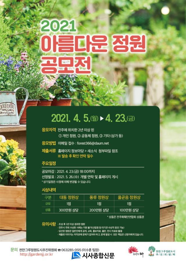 ÀüÁÖ½Ã¿Í Ãµ¸¸±×·çÁ¤¿øµµ½ÃÃßÁøÀ§¿øÈ¸´Â ¿À´Â 23ÀϱîÁö Á¶¼ºµÈ Áö 2³â ÀÌ»ó µÈ ¹Î°£ Á¤¿øÀ» ´ë»óÀ¸·Î ¡®2021 ¾Æ¸§´Ù¿î Á¤¿ø °ø¸ðÀü¡¯À» °³ÃÖÇÑ´Ù. °ø¸ðÀüÀº õ¸¸±×·ç Á¤¿øµµ½Ã ÇÁ·ÎÁ§Æ®ÀÇ ÀÏȯÀ¸·Î Áö³ÇØ¿¡ À̾î À̹øÀÌ 2ȸ°´Ù.