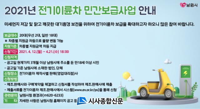 Àü±âÀÌ·ûÂ÷ ¹Î°£º¸±Þ»ç¾÷¿¡ ´ëÇÑ ÀÚ¼¼ÇÑ »çÇ×Àº ³²¿ø½Ã ȨÆäÀÌÁö(http://www.namwon.go.kr) °ø°í¹®À» Âü°íÇϰųª, ³²¿ø½Ã ȯ°æ°ú(620-6233) ¶Ç´Â Àü±âÀÌ·ûÂ÷ Á¦Àۻ纰 ÆÇ¸ÅÁ¡(¿µ¾÷´ë¸®Á¡)¿¡ ¹®ÀÇÇÏ¸é µÈ´Ù.