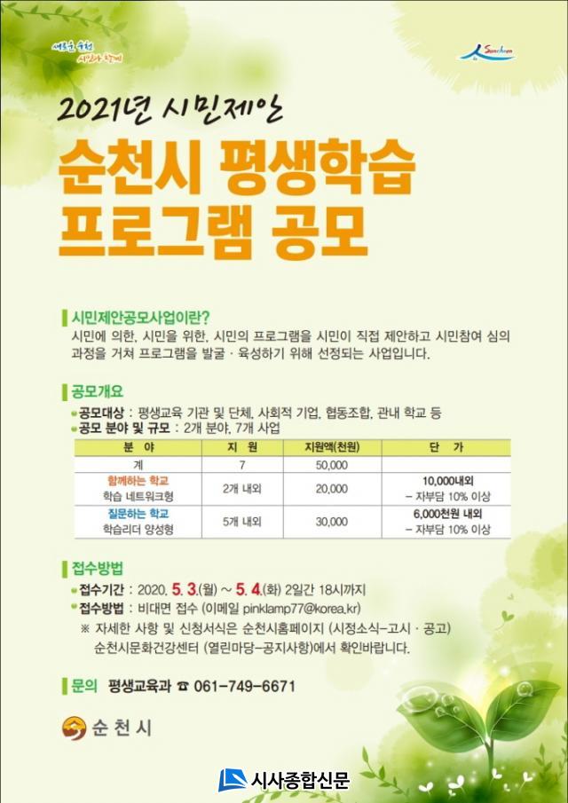 ¼øÃµ½Ã´Â À̹ø »ç¾÷À» ÅëÇØ ½Ã¹Î ½º½º·Î ¹è¿òÀ» ½ÇõÇÏ°í ¼ºÀåÇÒ ¼ö ÀÖ´Â ÁÖüÀû ÇнÀ ÇüÅ Ȯ»ê°ú Áö¿ª Ưȡ¤¹Ì·¡´ëÀÀ¡¤½Ã¹Î·Â Çâ»ó ±³À° °úÁ¤ È®´ë ¹× Æò»ýÇнÀ ³»½Çȸ¦ ´ÙÁö¸ç, ¼±Á¤µÈ ÇÁ·Î±×·¥ ¿î¿µ¿¡ ÃÑ 5õ¸¸¿øÀ» Áö¿øÇÒ ¿¹Á¤ÀÌ´Ù.