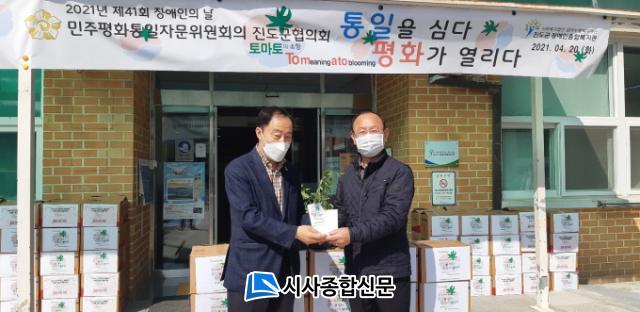 Á¦41ȸ Àå¾ÖÀÎÀÇ ³¯À» ¸Â¾Æ ¹ÎÁÖÆòÈÅëÀÏÀÚ¹®À§¿øÈ¸ÀÇ Áøµµ±ºÇùÀÇȸ°¡ Á¤¼Áö¿ø »ç¾÷ÀÇ ÀÏȯÀ¸·Î ÆòÅëÀ§¿øµéÀÇ ¼º±Ý 100¿©¸¸¿øÀ¸·Î ¡®Çູ Å丶Åä ¸ðÁ¾¡¯À» ±¸ÀÔ, Àå¾ÖÀεéÀÌ °¡Á¤¿¡¼ Ű¿ï ¼ö ÀÖ´Â Å丶Åä ¸ðÁ¾À» Àü´ÞÇß´Ù.