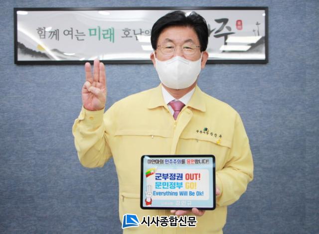 ÇÑÆí, °ÀÎ±Ô ³ªÁÖ½ÃÀåÀº ¡°±º»çÁ¤±Ç¿¡ ¸Â¼ ¹ÎÁÖÁÖÀǸ¦ ÁöÄѿ ´ëÇѹα¹ÀÇ ±¹¹Î ÇÑ »ç¶÷À¸·Î¼ ¹Ì¾á¸¶ ±ººÎ¸¦ ±ÔźÇÏ°í ¹Ì¾á¸¶ ±¹¹ÎÀÇ ¹ÎÁÖÁÖÀÇ ¼öÈ£ÀÇ ¿¸ÁÀ» ÀÀ¿øÇÑ´Ù¡±¸ç ¡°ÇϷ绡¸® ¹ÎÁÖÁÖÀÇÀÇ ½Â¸®¸¦ ÅëÇØ µû¶æÇÏ°í ÆòÈ·Î¿î ¹Ì¾á¸¶ÀÇ º½ÀÌ Ã£¾Æ¿À±â¸¦ ±â¿øÇÑ´Ù¡±°í ¸»Çß´Ù.