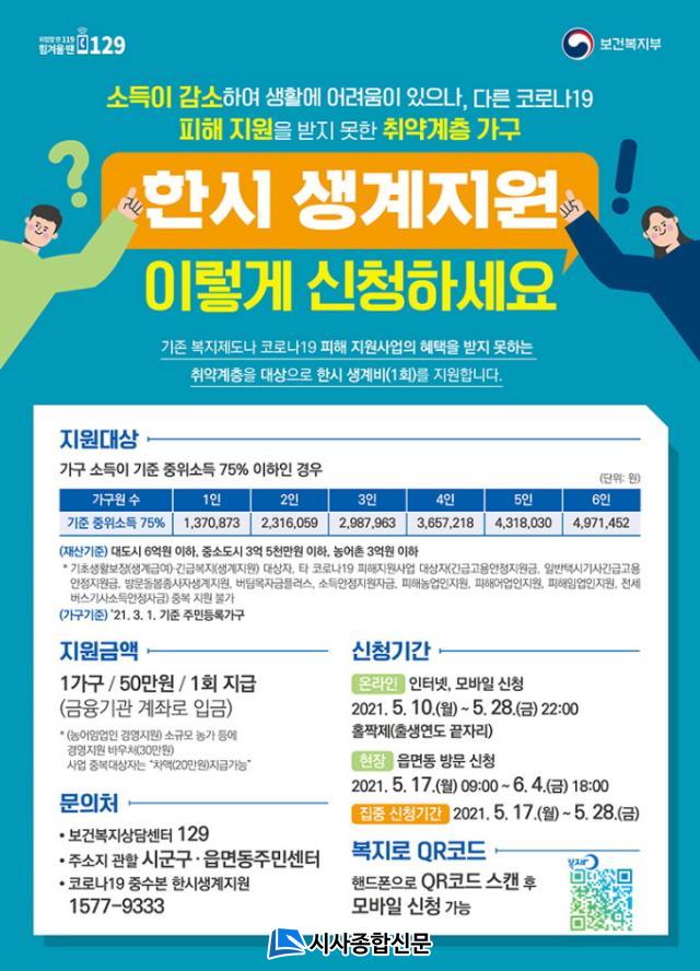 Çѽà »ý°èÁö¿ø ½ÅûÀº ¿À´Â 10ÀϺÎÅÍ 28ÀϱîÁö ¿Â¶óÀÎ º¹Áö·Î(www.bokjiro.go.kr) »çÀÌÆ®¿¡¼ ½ÅûÇϰųª ¿À´Â 17ÀϺÎÅÍ ´ÙÀ½´Þ 4ÀϱîÁö ÁÖ¼ÒÁö °üÇÒ À¾¸é ÇàÁ¤º¹Áö¼¾Å͸¦ ¹æ¹®ÇØ ½ÅûÇÒ ¼ö ÀÖ´Ù.