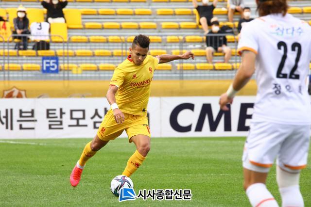 ±¤ÁÖ°¡ Ȩ ÀÌÁ¡À» ¾Õ¼¼¿ö Á¦ÁÖ¸¦ ¾Ð¹ÚÇß´Ù. Àü¹Ý 5ºÐ ¾öÁö¼ºÀÇ ¿Þ¹ß Á߰Ÿ® ½´ÆÃÀ¸·Î Æ÷¹®À» ¿¾ú°í, 9ºÐ ÇìÀ̽ºÀÇ ¿À¸¥¹ß ÇÁ¸®Å±Àº ¿À½ÂÈÆ ǰ¿¡ ¾È°å´Ù.
