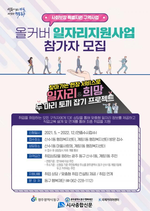 µ¿±¸´Â »çȸº¸À寝º°Áö¿ø±¸¿ª ¸ÂÃãÇü ¡®¿ÃÄ¿¹ö¡¯ ÀÏÀÚ¸®Áö¿ø »ç¾÷ ÃßÁøÀ» À§ÇØ ÀÏÀÚ¸® Àü¹®±â°üÀÎ ¡®±¹Á¦Ä¿¸®¾î¼¾ÅÍ¡¯¿Í Çù¾àÀ» ¸Î°í Ãë¾÷À» Èñ¸ÁÇÏÁö¸¸ Á¤º¸ ºÎÀç ¹× °Åµ¿ÀÌ ºÒÆíÇÑ ÁÖ¹ÎÀ» Á÷Á¢ ã¾Æ°¡ 1:1 »ó´ãÀ¸·Î Á÷¾÷±³À° ¼³°è ¹× ¿¬°è, ¸ÂÃãÇü ÀÏÀÚ¸® Á¤º¸ Á¦°ø µîÀ» Áö¿øÇÒ °èȹÀÌ´Ù.