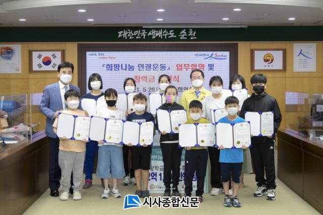 À̳¯ Çù¾à½Ä¿¡´Â Çã¼® ¼øÃµ½ÃÀå°ú (»ç)Èñ¸ÁÀ»³ª´©´Â»ç¶÷µé ±èÁ¤¾È ȸÀåÀÌ Âü¼®ÇØ ¾÷¹« Çù¾àÀ» ü°áÇѵ¥ À̾î ÀåÇÐ±Ý Áö¿ø´ë»óÀÚ 12¸í¿¡ ´ëÇÑ ÀåÇÐÁõ¼¸¦ Àü´ÞÇß´Ù.