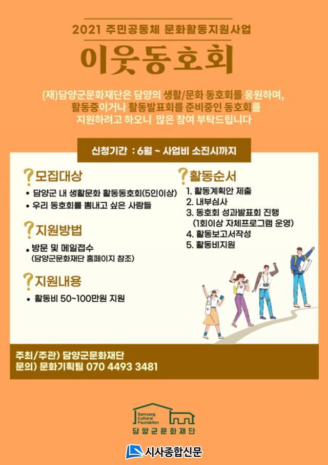 Áֹΰøµ¿Ã¼ ¹®ÈȰµ¿Áö¿ø»ç¾÷ ¡®ÀÌ¿ôµ¿È£È¸¡¯´Â ´ã¾çÀÇ 12°³ À¾¸é »ýȰ¡¤¹®È¡¤¿¹¼ú µ¿È£È¸¸¦ Áß½ÉÀ¸·Î Ȱµ¿ ÁßÀ̰ųª, Ȱµ¿À» ÁغñÇϰí ÀÖ´Â µ¿È£È¸¸¦ Áö¿øÇØ °øµ¿Ã¼ÀÇ ¿ª·®À» °ÈÇÏ´Â »ç¾÷ÀÌ´Ù.