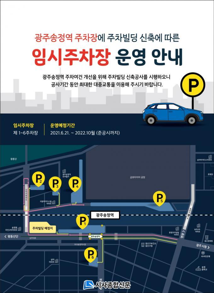 ¿ì¼±, ÀÓ½ÃÁÖÂ÷ÀåÀ» ¿î¿µÇϱâ À§ÇØ ±×µ¿¾È ±¤ÁÖ½Ã¿Í ÄÚ·¹ÀÏÀº ¼ÛÁ¤¿ª Àαٿ¡ 6°³¼ÒÀÇ ÀÓ½ÃÁÖÂ÷ÀåÀ» ¸¶·ÃÇÏ°í ¿îÀüÀÚµéÀÌ ÀÓ½ÃÁÖÂ÷ÀåÀ» ½±°Ô ã¾Æ°¥ ¼ö ÀÖµµ·Ï µµ·Î ¹Ù´Ú¿¡ ¼ÛÁ¤¿ª¿¡¼ ÀÓ½ÃÁÖÂ÷ÀåÀ¸·Î ¾È³»ÇÏ´Â Ä®·¯À¯µµ¼± ¼³Ä¡¸¦ ¿Ï·áÇß°í, ¼ÛÁ¤¿ª Èĸ鿡 À§Ä¡ÇÑ ÀÓ½ÃÁÖÂ÷Àå¿¡¼ ½Ã³» ¹æÇâÀ¸·Î ³ª¿À´Â ¿îÀüÀÚ¸¦ À§ÇØ Ãⱸ À¯µµ¼± ¹Ù´Ú Ç¥½Ãµµ ¼³Ä¡Çß´Ù. (Ä®¶óÀ¯µµ¼±°ú ¾È³»Ç¥ÁöÆÇ ¼³Ä¡ ÇöÀå »çÁø Âü°í)