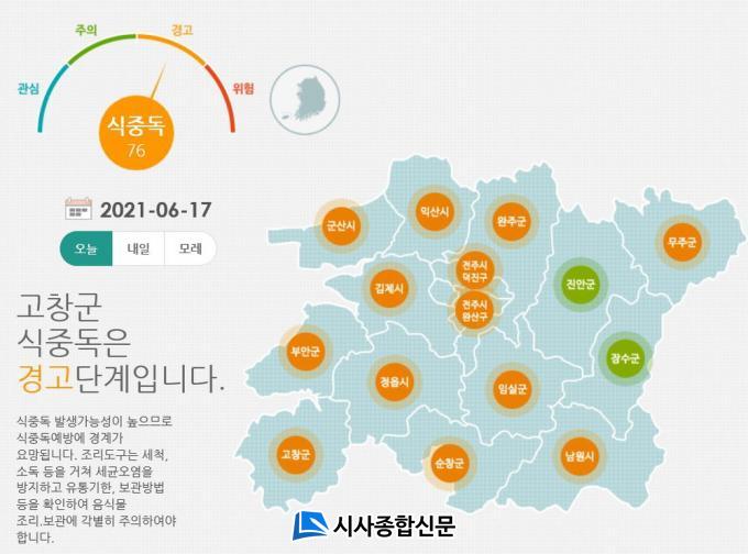 ½ÄÁßµ¶Áö¼ö´Â ±â¿Â, ½Àµµ µîÀ» °í·ÁÇØ ½ÄÁßµ¶ ¹ß»ý °¡´É¼ºÀ» ¼ýÀڷΠǥ±âÇß´Ù. ¡ã55¹Ì¸¸Àº °ü½É ¡ã71 ¹Ì¸¸Àº ÁÖÀÇ ¡ã86¹Ì¸¸Àº °æ°í ¡ã86ÀÌ»óÀº À§ÇèÀÇ 4´Ü°è·Î ºÐ·ùµÈ´Ù.