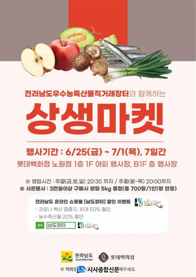 »ó»ýÀåÅÍ´Â 25ÀϺÎÅÍ 7¿ù 1ÀϱîÁö ·Ôµ¥¹éÈÁ¡ ³ë¿øÁ¡ 1Ãþ Á¤¹®°ú ÁöÇÏ 1Ãþ Çà»çÀå¿¡¼ ÆîÃÄÁø´Ù. Àü³²Áö¿ª 24°³ ³ó¾î°¡°¡ Âü¿©ÇØ 300¿© ¿ì¼ö ³ó¼öƯ»ê¹°À» ¼±ºÈ´Ù.