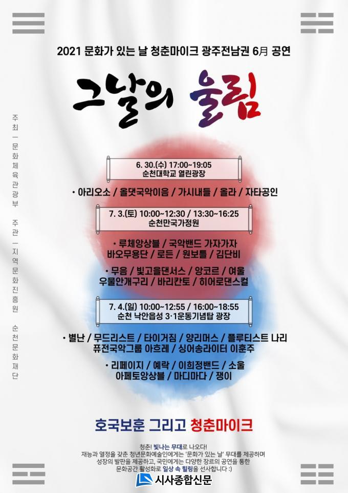 ¡®2021 ûÃḶÀÌÅ© ±¤ÁÖ¡¤Àü³²¡¯ 6¿ù °ø¿¬Àº ¡®±×³¯ÀÇ ¿ï¸²¡¯À̶ó´Â ÄܼÁÆ®·Î 6¿ù È£±¹º¸ÈÆÀÇ ´ÞÀ» ±â³ä, Àǹ̸¦ µÇ»õ±â°í Æòȸ¦ ±â¸®´Â °ø¿¬À» ±âȹÇÏ¿© ÆòÈ, À§·Î, Èñ»ý, °¨»ç, »ç¶ûÀ» ÁÖÁ¦·Î û³â¿¹¼ú°¡µéÀÇ °ø¿¬À¸·Î ÁøÇàµÉ ¿¹Á¤ÀÌ´Ù.