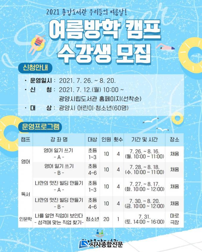 ÇÑÆí, ¿©¸§¹æÇÐ Ä·ÇÁ Âü°¡ ½ÅûÀº 7¿ù 12ÀÏ ¿ÀÀü 10½ÃºÎÅÍ ±¤¾ç½Ã¸³µµ¼°ü ȨÆäÀÌÁö(lib.gwangyang.go.kr)¸¦ ÅëÇØ °¡´ÉÇϸç, ÀÚ¼¼ÇÑ »çÇ×Àº ½Ã¸³µµ¼°ü ȨÆäÀÌÁö¸¦ ¹æ¹®Çϰųª ±¤¾ç¿ë°µµ¼°ü(¢Ï061-797-3857)À¸·Î ¹®ÀÇÇÏ¸é ¾Ë ¼ö ÀÖ´Ù.