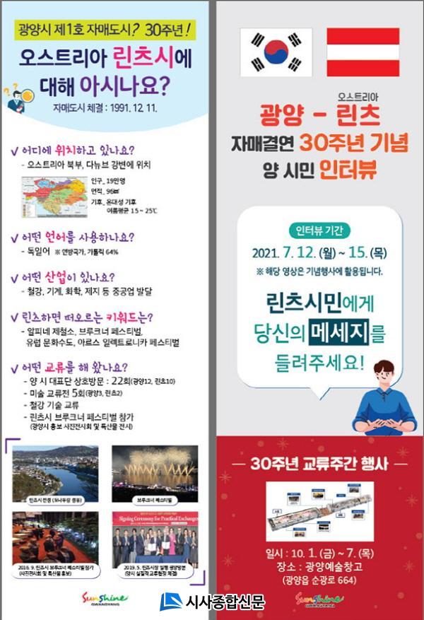 ±¤¾ç½Ã´Â ¸°Ã÷½Ã¿Í ÀڸŰῬ 30ÁÖ³âÀ» ±â³äÇϱâ À§ÇØ ¿À´Â 10¿ù 1~7ÀÏ ±¤¾ç¿¹¼úâ°í µî ±¤¾ç½Ã ÀÏ¿ø¿¡¼ ±â³ä»ç¾÷(±³·ùÁÖ°£)À» ÆîÄ¥ ¿¹Á¤À̸ç, ¸°Ã÷½Ã¿Í ÇùÀÇÇØ ¾ç ½Ã¹Î ÀÎÅͺ並 »çÀü¿¡ ÁøÇàÇÑ´Ù.