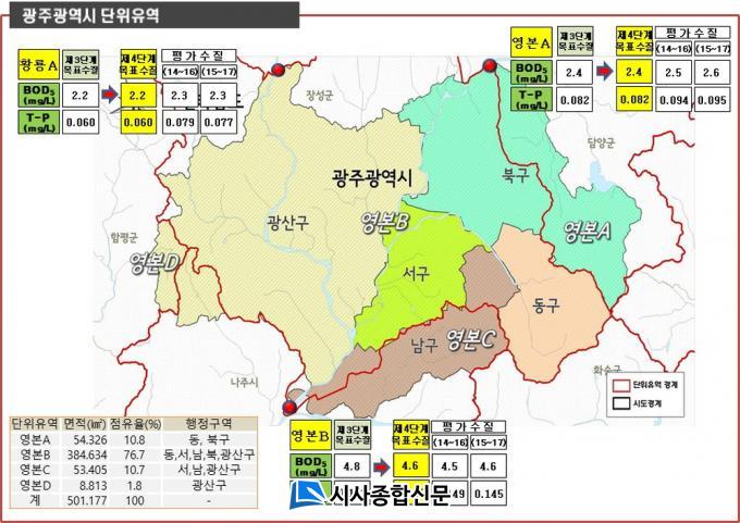 ±¤Áֽà ´ÜÀ§À¯¿ªº° ¸ñÇ¥¼öÁúÀº ±¤ÁÖ¿Í ³ªÁÖ °æ°èÀÇ ½ÂÃ̺¸ ÁöÁ¡(¿µº»B)¿¡¼ »ý¹°ÈÇÐÀû»ê¼Ò¿ä±¸·®(BOD) 4.6§·/L, ÃÑÀÎ(T-P) 0.145§·/LÀ¸·Î Àü ´Ü°è(3´Ü°è)¿¡ ºñÇØ ´Ù¼Ò °ÈµÆ´Ù.