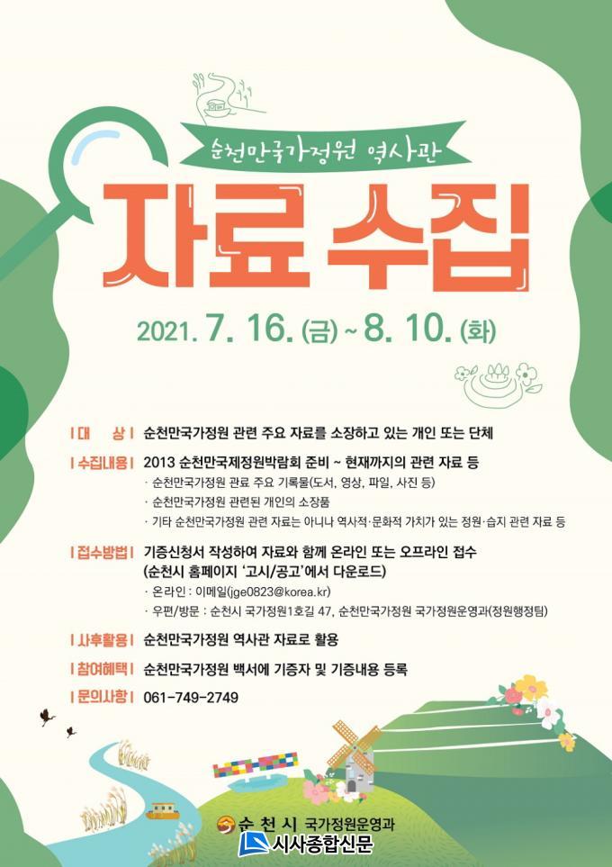 ¼öÁý´ë»óÀº ¡®2013¼øÃµ¸¸±¹Á¦Á¤¿ø¹Ú¶÷ȸ¡¯ÁغñºÎÅÍ ÇöÀçÀÇ ¼øÃµ¸¸±¹°¡Á¤¿ø °ü·Ã Ã¥ÀÚ¡¤¿µ»ó¡¤»çÁø µî ±â·Ï¹°°ú °ü·Ã ¹°Ç°ÀÌ´Ù. ƯÈ÷ ¼øÃµ¸¸±¹°¡Á¤¿ø°ú ÇÔ²²ÇÑ °ü°èÀÚ, ÀÚ¿øºÀ»çÀÚ, ÇØ¼³»ç µîÀÇ ±¹°¡Á¤¿ø °ü·Ã ÈçÀûÀÌ ´ã±ä °³ÀÎÀÇ ¼ÒÀåǰµéÀ» ÁýÁß ¼öÁýÇÑ´Ù. ¼øÃµ¸¸±¹°¡Á¤¿ø °ü·Ã ÀÚ·á´Â ¾Æ´Ï³ª ¿ª»çÀû¡¤¹®ÈÀû °¡Ä¡°¡ ÀÖ´Â Á¤¿ø°ú ½ÀÁö °ü·Ã ÀÚ·áµµ ±âÁõÇÒ ¼ö ÀÖ´Ù.