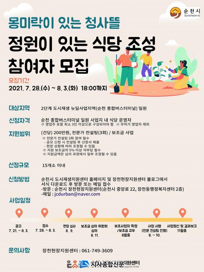 ¼øÃµ½Ã´Â Á¾ÇÕ¹ö½ºÅ͹̳ΠÀÏ¿ø µµ½ÃÀç»ý Ȱ¼ºÈ»ç¾÷ ±¸¿ªÀÇ µµ½Ã°æ°ü ¹× ȯ°æ °³¼±À» À§ÇØ ¿À´Â 8¿ù 3ÀϱîÁö ¡®Á¤¿øÀÌ ÀÖ´Â ½Ä´ç¡¯ Á¶¼º»ç¾÷ Âü°¡ÀÚ¸¦ ¸ðÁýÇÑ´Ù.