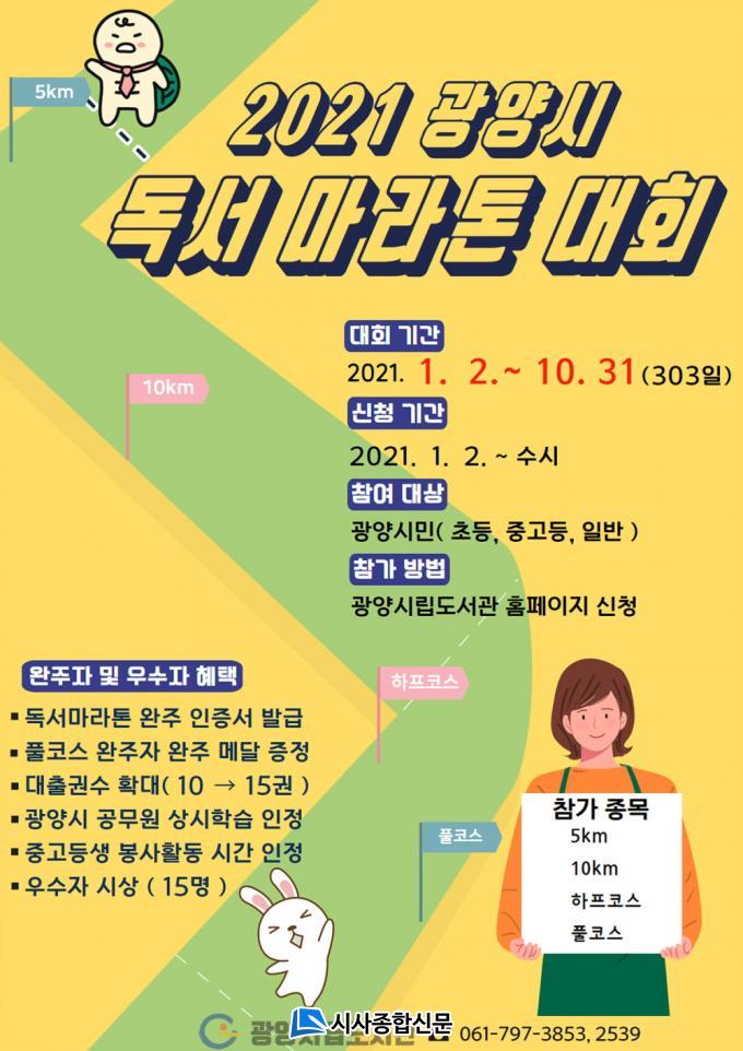 µ¶¼ ¸¶¶óÅæ ´ëȸ Âü¿©¸¦ ¿øÇÏ´Â ½Ã¹ÎÀº ±¤¾ç½Ã¸³µµ¼°ü ȨÆäÀÌÁö(lib.gwangyang.go.kr)¸¦ ¹æ¹®Çϰųª ±¤¾ç½Ã¸³µµ¼°ü(¢Ï061-797-3853)À¸·Î ¹®ÀÇÇÏ¸é ¾Ë ¼ö ÀÖ´Ù.