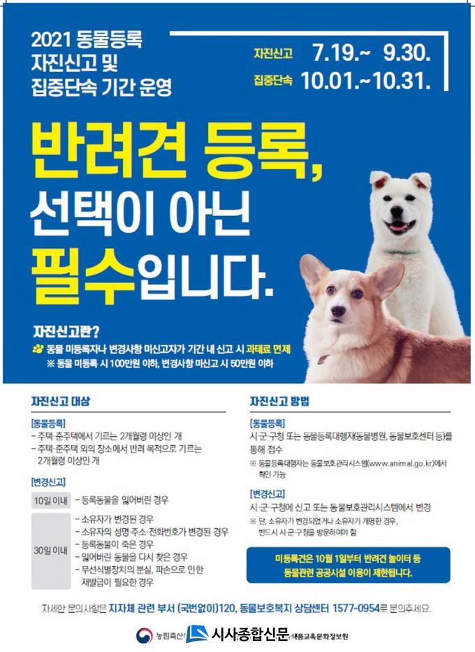 µî·Ï ÀÌÈÄ¿¡µµ ¼ÒÀ¯ÀÚÀÇ ÁÖ¼Ò, ÀüȹøÈ£ µîÀÌ º¯°æµÈ °æ¿ì¿¡´Â º¯°æ ½Å°í¸¦ ÇØ¾ß ÇÑ´Ù. µî·ÏÀº °ü³» 3°³ µ¿¹°º´¿ø(³ªÁÖÁ¾ÇÕ¡¤Ã¤¿ò¡¤°¡¶÷)°ú À¯±âµ¿¹°º¸È£¼¾ÅÍ(»êÆ÷¸é)¿¡¼ ÇÏ¸é µÈ´Ù.