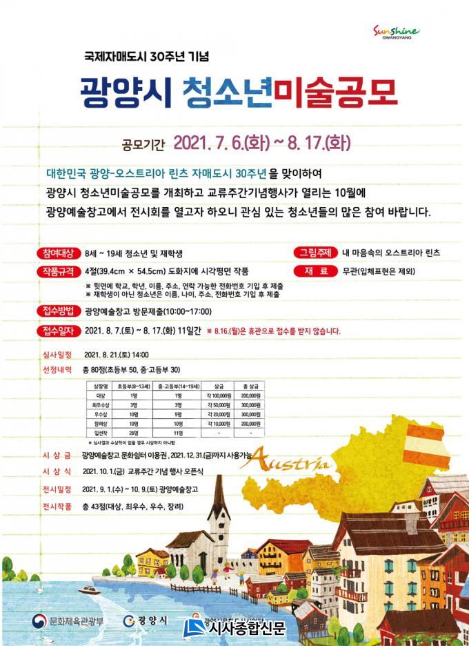 Á¢¼ö´Â ¿À´Â 8¿ù 17ÀϱîÁö ±¤¾ç¿¹¼úâ°í »ç¹«½Ç·Î ¹æ¹®ÇØ Á¦ÃâÇÏ¸é µÇ°í, Á¢¼öµÈ ¹Ì¼úÀÛǰ Áß ÃÑ 80Á¡(ÃʵîºÎ 50Á¡, Áß¡¤°íµîºÎ 30Á¡)À» ¼±Á¤ÇØ »óÀå(´ë»ó 2¸í, ÃÖ¿ì¼ö»ó 6¸í, ¿ì¼ö»ó 15¸í, Àå·Á»ó 20¸í, ÀÔ¼± 37¸í)°ú ÃÑ 100¸¸ ¿ø »ó´çÀÇ ºÎ»óÀ» ¼ö¿©ÇÒ °èȹÀÌ´Ù.