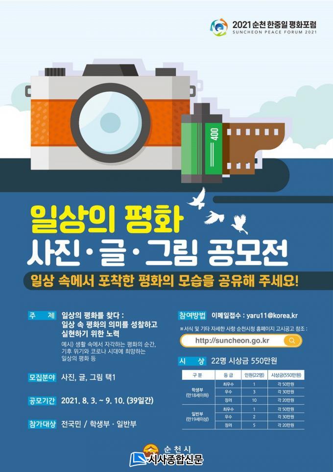 ÇÑÆí, ¼øÃµ½Ã´Â ¾Èº¸¡¤ÅëÀÏÀÇ Æòȸ¦ ³Ñ¾î ±âÈÄ À§±â ½Ã´ë °øÁ¸°ú ¹ø¿µ, ¸¶À½ÀÇ ÆòÈ¿Í °°Àº Àû±ØÀû ÀǹÌÀÇ Æòȸ¦ ±¸Ã¼ÈÇϱâ À§ÇØ 10¿ù 8ÀϺÎÅÍ 9ÀϱîÁö ÀÌÆ²°£ ¼øÃµ¸¸±¹Á¦½ÀÁö¼¾ÅÍ¿¡¼ ¡®ÇÔ²² ´©¸®´Â ÀÏ»óÀÇ ÆòÈ¡¯¸¦ ÁÖÁ¦·Î ¡®2021 ¼øÃµ ÇÑÁßÀÏ ÆòÈÆ÷·³¡¯À» °³ÃÖÇÑ´Ù. Æ÷·³ÀÇ Àü ÀÏÁ¤Àº ÁÜ È»óȸÀǸ¦ ÅëÇØ À¯Æ©ºê·Î ½Ç½Ã°£ »ýÁß°èµÉ ¿¹Á¤ÀÌ´Ù.