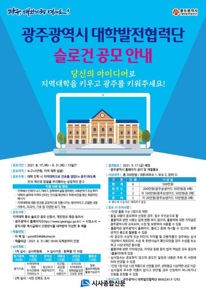 Âü°¡½ÅûÀº 16ÀϺÎÅÍ ½Ã ȨÆäÀÌÁö °øÁö»çÇ׿¡¼ ½Åû¾ç½ÄÀ» ³»·Á ¹Þ¾Æ ÀÛ¼ºÇØ ÀüÀÚ¸ÞÀÏ·Î Á¦ÃâÇÏ¸é µÇ¸ç, Á¢¼ö±â°£Àº 17ÀϺÎÅÍ 31ÀϱîÁö´Ù. º¸´Ù ÀÚ¼¼ÇÑ »çÇ×Àº ½Ã ´ëÇйßÀüÇù·Â´Ü(062-613-1292)À¸·Î ¹®ÀÇÇÏ¸é µÈ´Ù.