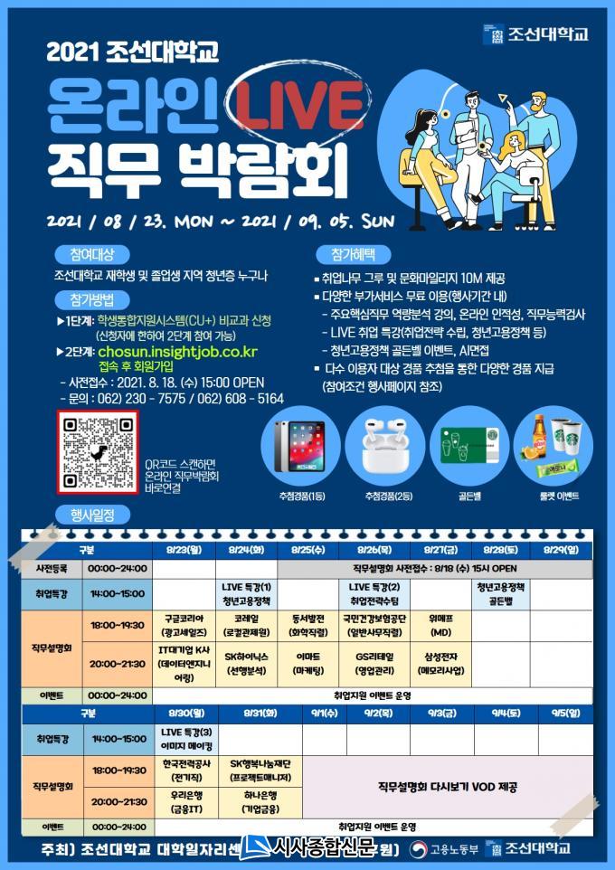 ÀçÇлýÀÇ °æ¿ì ÇлýÅëÇÕÁö¿ø½Ã½ºÅÛ(https://cuplus.chosun.ac.kr) ºñ±³°ú°úÁ¤ ÇÁ·Î±×·¥À» ÅëÇØ 1Â÷ ½ÅûÀ» ÇÑ µÚ ¿Â¶óÀÎ Á÷¹«¹Ú¶÷ȸ Àü¿ë ȨÆäÀÌÁö(chosun.insightjob.co.kr)¸¦ ÅëÇØ 2Â÷ ½ÅûÀ» Á¢¼öÇÏ¸é µÈ´Ù. Áö¿ª û³âÀÇ °æ¿ì Á¶¼±´ëÇб³ ¿Â¶óÀÎ Á÷¹«¹Ú¶÷ȸ Àü¿ë ȨÆäÀÌÁö¸¦ ÅëÇØ ½ÅûÇÏ¸é µÈ´Ù. »çÀü Á¢¼ö´Â 18ÀϺÎÅÍ 22ÀϱîÁö´Ù.
