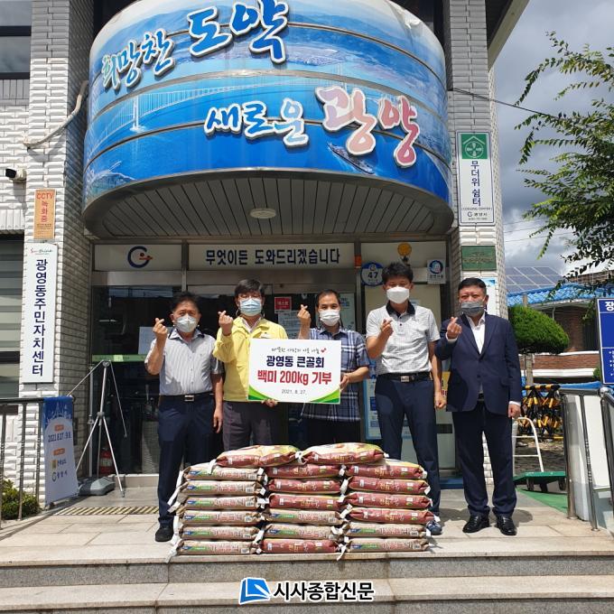[½Ã»çÁ¾ÇսŹ® = Àå¹Î±Ô ±âÀÚ] ±¤¾ç½Ã ±¤¿µµ¿ Å«°ñȸ(ȸÀå Á¤Àº±â)´Â 8¿ù 27ÀÏ ±¤¿µµ¿ Áֹμ¾ÅÍ¿¡ ¾î·Á¿î ÀÌ¿ôÀ» À§ÇØ ½Ò 200kgÀ» Àü´ÞÇÏ¸ç ¡®Äڷγª19 ±Øº¹, »ç¶û ³ª´® ±âºÎ ¸±·¹ÀÌ¡¯ ¿¡ µ¿ÂüÇß´Ù°í ¹àÇû´Ù.