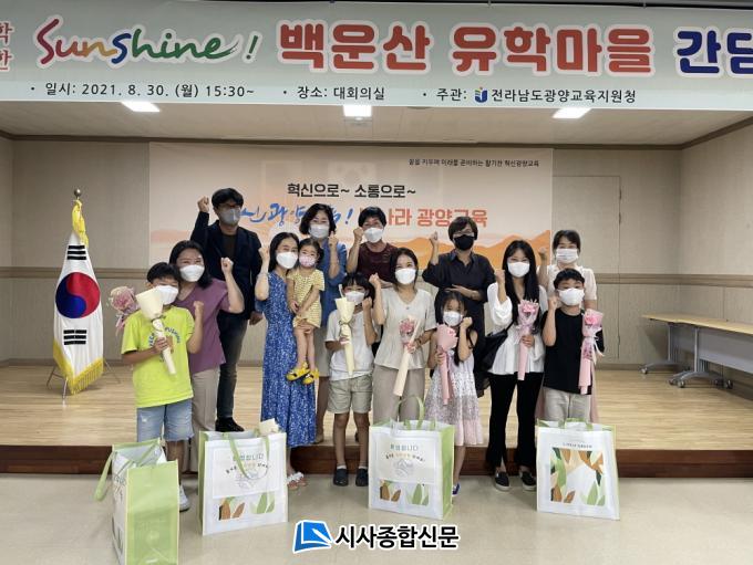 [½Ã»çÁ¾ÇսŹ® = Àå¹Î±Ô ±âÀÚ] ±¤¾ç±³À°Áö¿øÃ»(±³À°Àå Á¶Á¤ÀÚ)Àº 8¿ù 30ÀÏ(¿ù) ±¤¾ç±³À°Áö¿øÃ» ´ëȸÀǽǿ¡¼ ¼¿ï¿¡¼ À¯ÇÐÀ» ¿Â 6¸íÀÇ À¯Çлý°ú 4¸íÀÇ À¯Çлý ºÎ¸ð, ¸¶À»Çб³ ´ëÇ¥¸¦ ¸ð½Ã°í ¡ºSunshine! ¹é¿î»ê À¯Çи¶À»¡»°£´ãȸ¸¦ °³ÃÖÇÏ¿´´Ù.