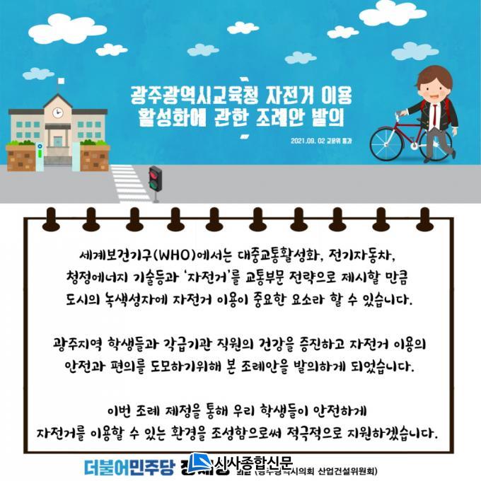 ÀåÀ缺 ÀÇ¿øÀº ¡°±¤ÁÖÁö¿ª Çлýµé°ú °¢±Þ±â°ü Á÷¿øÀÇ °Ç°À» ÁõÁøÇϰí ÀÚÀü°Å ÀÌ¿ëÀÇ ¾ÈÀü°ú ÆíÀǸ¦ µµ¸ðÇϱâ À§ÇØ º» Á¶·Ê¾ÈÀ» ¹ßÀÇÇß´Ù¡±°í Á¦Á¤ ÃëÁö¸¦ ¼³¸íÇß´Ù.