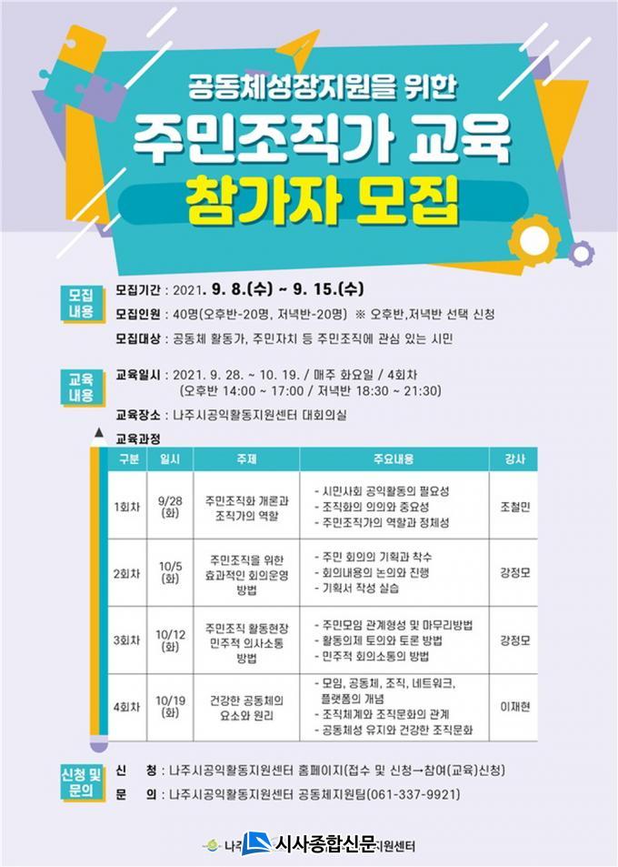 À̹ø ±³À°Àº ÀÌ´Þ 28ÀϺÎÅÍ 10¿ù 19ÀϱîÁö °øÀÍȰµ¿Áö¿ø¼¾ÅÍ ´ëȸÀǽǿ¡¼ ¿ÀÈĹÝ(14~17½Ã)¡¤Àú³á¹Ý(18½Ã30ºÐ~21½Ã30ºÐ)À¸·Î ³ª´µ¾î ¹Ýº° 4ȸÂ÷ °úÁ¤À¸·Î ¿î¿µµÈ´Ù.