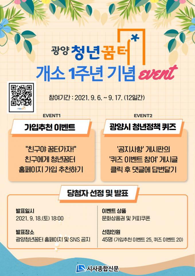 ±¤¾çû³â²ÞÅÍ È¨ÆäÀÌÁö¿Í SNS¸¦ ÅëÇØ ÁøÇàµÇ´Â À̹ø À̺¥Æ®´Â ¡®°¡ÀÔÃßõ À̺¥Æ®¡¯, ¡®Ã»³âÁ¤Ã¥ ÄûÁî À̺¥Æ®¡¯ µî ´õ ¸¹Àº û³âÀÌ ÇÔ²²Çϰí Âü¿©ÇÒ ¼ö ÀÖµµ·Ï ±¸¼ºµÆÀ¸¸ç, 9¿ù 17ÀϱîÁö ÁøÇàµÈ´Ù.