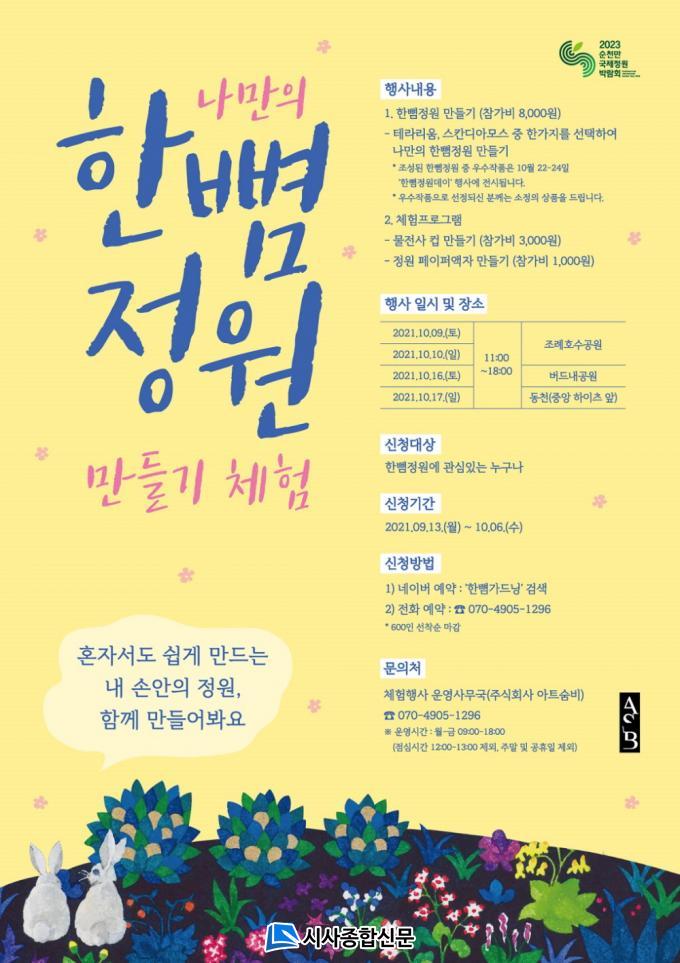 À̹ø ¡®³ª¸¸ÀÇ ÇÑ»ÂÁ¤¿ø ¸¸µé±â¡¯ üÇèÇà»ç´Â µµ½É Àüü°¡ Á¤¿øÀÌ µÇ´Â 2023¼øÃµ¸¸±¹Á¦Á¤¿ø¹Ú¶÷ȸÀÇ ¼º°øÀû °³ÃÖ¸¦ ½Ã¹Î°ú ÇÔ²² ¸¸µé±â À§ÇØ ¸¶·ÃµÈ Çà»ç·Î, 10¿ù 9ÀϺÎÅÍ 17ÀϱîÁö Å䡤ÀÏ¿äÀÏ 4Àϵ¿¾È Á¶·ÊÈ£¼ö°ø¿ø¡¤¹öµå³»°ø¿ø¡¤µ¿Ãµ¿¡¼ ÁøÇàµÉ ¿¹Á¤ÀÌ´Ù.