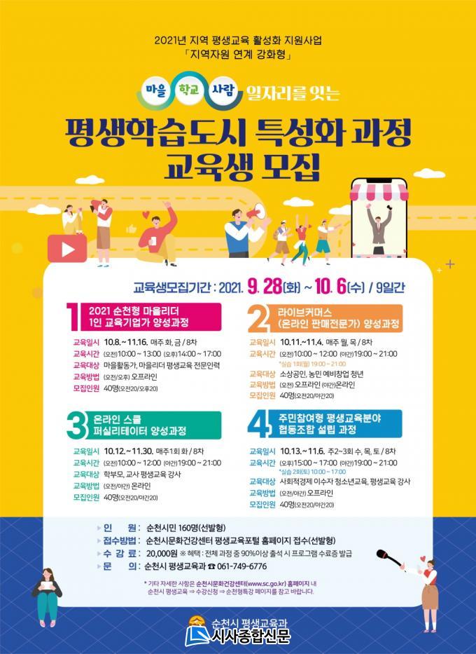 À̹ø ±³À°Àº ¡ã2021 ¼øÃµÇü Æò»ýÇнÀ ¸¶À»¸®´õ 1ÀÎ ±³À°±â¾÷°¡ ¾ç¼º°úÁ¤, ¡ã¶óÀ̺êÄ¿¸Ó½º ¿Â¶óÀÎ ÆÇ¸ÅÀü¹®°¡ ¾ç¼º°úÁ¤, ¡ã¿Â¶óÀÎ ½ºÄð ÆÛ½Ç¸®Å×ÀÌÅÍ ¾ç¼º°úÁ¤, ¡ãÁÖ¹ÎÂü¿©Çü Æò»ý±³À°ºÐ¾ß Çùµ¿Á¶ÇÕ ¼³¸³ ÃÑ 4°³ °úÁ¤À¸·Î, ¼øÃµ½Ã¹Î 160¸íÀ» ¼±¹ßÇÏ¿© 10¿ù 8ÀϺÎÅÍ 11¿ù 30ÀϱîÁö ¿Â¡¤¿ÀÇÁ¶óÀÎ º´ÇàÇÏ¿© ÁøÇàµÈ´Ù.