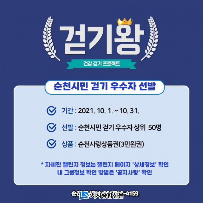10¿ù 1ÀϺÎÅÍ 31ÀϱîÁö ÇÑ´Þ°£ ¿î¿µµÇ´Â ¼øÃµ½Ã¹Î °È±â¿Õ 縰Áö´Â ÇÑ´Þµ¿¾È ÃÖ´ë ´©Àû °ÉÀ½¼ö¸¦ ´Þ¼ºÇÑ »óÀ§ 50¸íÀ» ¼±¹ßÇØ ¼øÃµ»ç¶û»óǰ±Ç(3¸¸¿ø)À» ÁõÁ¤ÇÑ´Ù.