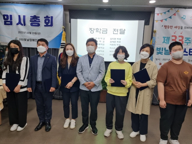 (»ç)ºû³¯Àå¾ÖÀÎÇùȸ´Â ¡°ÆòµîÇÑ ¼¼»óÀ» À§ÇÏ¿© ǰÀ§ ÀÖ°í Áú¼ ÀÖ°Ô¡± ¶ó´Â ºñÁ¯¾Æ·¡ ºû³¯Æä½ºÆ¼¹ú Çà»ç¸¦ ÁøÇàÇÑ ¹Ù, °ø·ÎÀÚ Ç¥Ã¢¼ö¿©¿Í Àå¾ÖÀÎ Áß∙°í∙´ëÇлý 6¸í¿¡°Ô ÀåÇÐ±Ý Àü´ÞÇÏ´Â ¼øÀ¸·Î ÁøÇàµÇ¾ú´Ù.