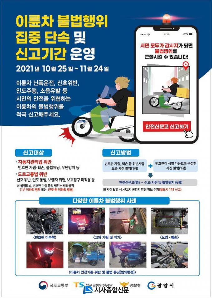 ±¤¾ç½Ã´Â 2021³â 10¿ù 25ÀÏ~11¿ù 24ÀÏ(1°³¿ù°£) ÀÌ·ûÂ÷ ºÒ¹ýÇàÀ§ ÁýÁß´Ü¼Ó ¹× ½Å°í±â°£À» ¿î¿µÇϰí, ¾ÈÀü½Å¹®°í ½º¸¶Æ®Æù ¾ÛÀ» ÅëÇÑ ÁֹνŰí Á¢¼ö¿Í ±â°£ Áß ±¤¾ç°æÂû¼, Çѱ¹±³Åë¾ÈÀü°ø´Ü µî °ü°è±â°ü ÇÕµ¿À¸·Î ´Ü¼ÓÀ» ½Ç½ÃÇÒ ¿¹Á¤ÀÌ´Ù.