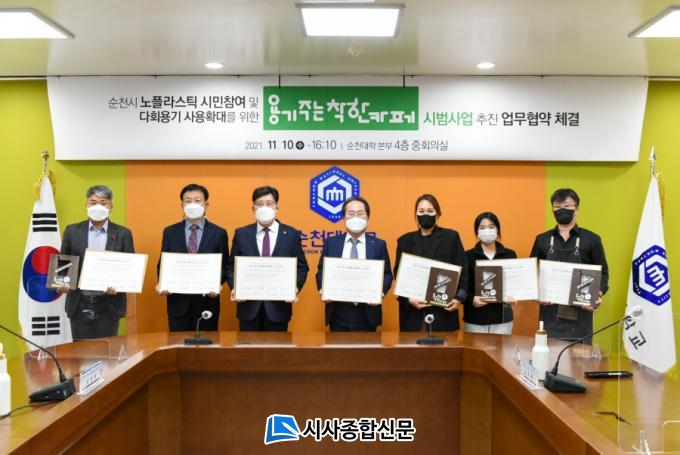 ¼øÃµ½Ã Áö¼Ó°¡´É¹ßÀüÇùÀÇȸ »óÀÓÀÇÀåÀÎ ¼øÃµ´ëÇб³ ¼Û°æÈ¯ ±³¼ö´Â ¡°È¯°æÀ» Áö۱â À§ÇØ Àϻ󿡼 ½ÇõÇÒ ¼ö ÀÖ´Â ´Ù¾çÇÑ È°µ¿ÀÌ ÁÖ¸ñ¹Þ´Â °¡¿îµ¥, ´ëÇп¡ ÀÔÁ¡ÇÑ Ä«Æä ´ëÇ¥´ÔµéÀÇ ³ëÇÃ¶ó½ºÆ½ ¿îµ¿À» ÅëÇÑ È¯°æ º¸È£ ¿îµ¿¿¡ ´ëÇÑ °ø°¨ÀÌ ÀÖ¾î À̹ø Çù¾àÀÌ °¡´ÉÇß´Ù.¡±¶ó¸ç, ¡°Äڷγª·Î ÀÎÇÑ ¾î·Á¿ò¿¡µµ ºÒ±¸Çϰí, ȯ°æÀ» Áö۱â À§ÇÑ È°µ¿¿¡ ¼±¶æ µ¿ÂüÇØÁֽŠ´ëÇ¥´Ôµé¿¡°Ô ´Ù½Ã Çѹø °¨»çÀÇ Àλ縦 µå¸°´Ù.¡±¶ó°í ¸»Çß´Ù.