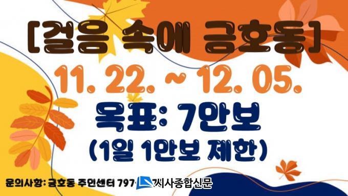 ¡®°ÉÀ½¼Ó¿¡ ±ÝÈ£µ¿¡¯ ¿öÅ©¿Â °È±â 縰Áö´Â 11¿ù 22ÀÏ~12¿ù 5ÀÏ(14Àϰ£) ¸ñÇ¥°ÉÀ½ 7¸¸ º¸ ÀÌ»ó ´Þ¼ºÀÚ ¼±Âø¼ø 100¸í¿¡°Ô ±ÝÈ£µ¿ ´ÜÁö ³»¿¡¼ »ç¿ë °¡´ÉÇÑ 1¸¸ ¿ø »óǰ±ÇÀ» Áö±ÞÇϸç, Áö¿ª ¼Ò»ó°øÀο¡°Ô µµ¿òÀÌ µÉ °ÍÀ¸·Î ±â´ëµÈ´Ù.
