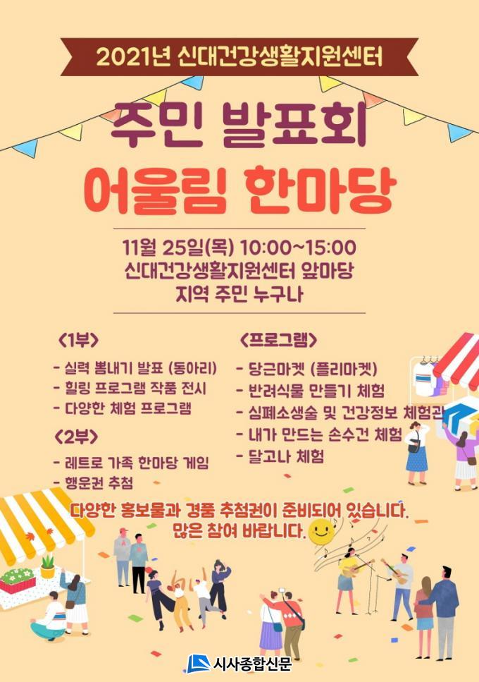 ½Å´ë°Ç°»ýȰÁö¿ø¼¾ÅÍ ¿î¿µÇùÀÇȸ ÁÖÃÖ·Î ¿¸®´Â À̹ø Çà»ç´Â ¼¾ÅÍ ¾Õ ±¤Àå ½Ç¿Ü °ø°£¿¡¼ Áֹεé°ú °Å¸®°¨ ¾ø´Â ¹«´ë¸¦ ¼³Ä¡ÇÏ¿©, 1ºÎ Çà»ç·Î Äڷγª À§±â ¼Ó¿¡¼µµ ±×µ¿¾È °¥°í´ÛÀº ½Ç·Â »Ë³»±â¿Í Àü½Ãȸ°¡ ÁøÇàµÇ¸ç, 2ºÎ Çà»ç·Î ·¹Æ®·Î °¡Á· ÇѸ¶´ç °ÔÀÓ, üÇèºÎ½º¸¦ ¿î¿µÇÏ¿© Áö¿ªÁֹεé°ú ¼ÒÅëÇÏ¸ç ´Ù¾çÇÑ °èÃþÀÇ ÁֹεéÀÌ ÇÔ²²ÇÏ´Â ½Ã°£À» °®´Â´Ù.