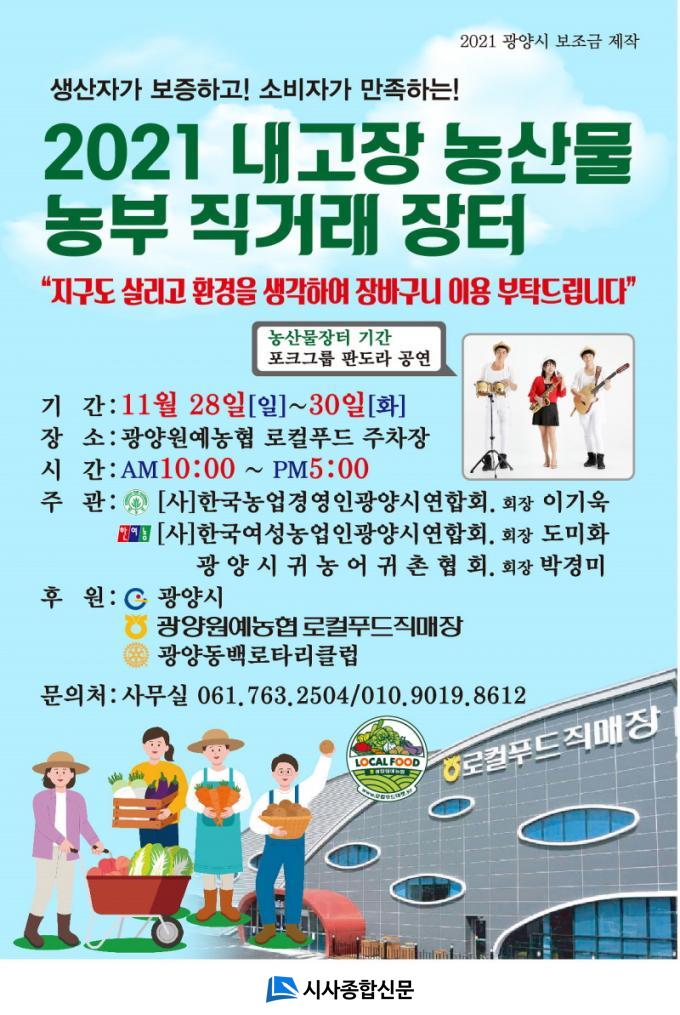 [½Ã»çÁ¾ÇսŹ® = Àå¹Î±Ô ±âÀÚ] ±¤¾ç½Ã´Â Çѱ¹³ó¾÷°æ¿µÀÎ ±¤¾ç½Ã¿¬ÇÕȸ(ȸÀå À̱â¿í), Çѱ¹¿©¼º³ó¾÷ÀÎ ±¤¾ç½Ã¿¬ÇÕȸ(ȸÀå µµ¹ÌÈ), ±¤¾ç½Ã ±Í³ó¾î±ÍÃÌÇùȸ(ȸÀå ¹Ú°æ¹Ì) ÁÖÃÖ/ÁÖ°üÀ¸·Î ¡®2021³â ³»°íÀå ³ó»ê¹° ³óºÎ Á÷°Å·¡ÀåÅÍ¡¯¸¦ ±¤¾ç¿ø¿¹³óÇù ·ÎÄÃǪµå ¾Õ ÁÖÂ÷Àå¿¡¼ ¿À´Â 11¿ù 28~30ÀÏ(3Àϰ£) ¿î¿µÇÑ´Ù.