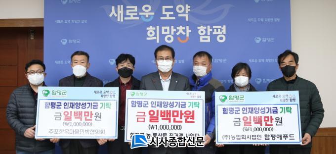 ÇÔÆò±º ÀÎÀç¾ç¼º ±â±ÝÀ¸·Î ¡ãÁÖÆ÷ÇÑ¿Á¸¶À»¹Î¹ÚÇùÀÇȸ(´ëÇ¥ ¼³¿µÈ£) ¡ãÇÔÆò±º ³ó¡¤Æ¯»ê¹° Á÷°Å·¡ »ç¾÷´Ü(´ëÇ¥ ÇÞ¸¾Àâ°î Á¤±â±Ù) ¡ã³ó¾÷ȸ»ç¹ýÀÎ ÇÔÆò¾ÖǪµå(³ª»ê¸é¡¤´ëÇ¥ Á¤¹Ì°æ) ¡ãÇÔÆòÀ¾ ´ëÈï½Ä´ç(´ëÇ¥ õÀçÈ«)¿¡¼ °¢ 100¸¸¿ø¾¿ ÃÑ 400¸¸¿øÀ» ±âŹÇß´Ù.