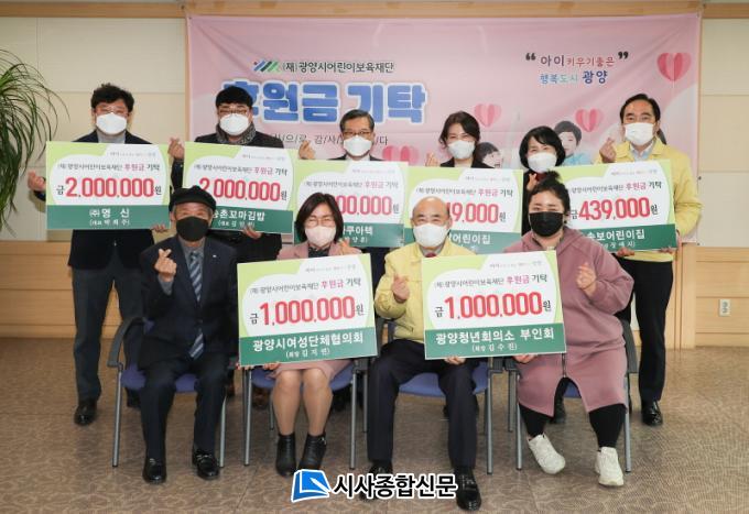 (Àç)±¤¾ç½Ã¾î¸°À̺¸À°Àç´ÜÀº Áö³ 9ÀÏ Á¤Çöº¹ ±¤¾ç½ÃÀå, °¿ëÀç »óÀÓÀÌ»ç, ±âŹÀÚ µî 10¿© ¸íÀÌ Âü¼®ÇÑ °¡¿îµ¥ ÈÄ¿ø±Ý ±âʽÄÀ» °¡Á³´Ù. ±âʽÄÀº ¾Æ·¡¿Í °°ÀÌ ÃÑ 8°³ ´Üü¿Í ¾÷ü¿¡¼ 1,308¸¸ 8õ ¿øÀÇ ¼ÒÁßÇÑ ÈÄ¿ø±ÝÀ» Àü´ÞÇß´Ù.