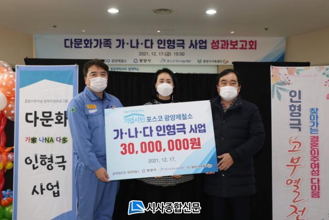 ÇÑÆí, ±¤¾çÁ¦Ã¶¼Ò´Â Áö³ 18³âºÎÅÍ Áö¿ª °áÈ¥ÀÌÁֹΠ¿©¼ºµéÀÇ Çѱ¹»ýȰ Á¤Âø°ú ÀÏÀÚ¸® ¿¬°è¸¦ À§ÇØ Åë¹ø¿ª Àü¹®Àη ±³À° °úÁ¤À» ±âȹÇÏ´Â µî Áö¿ª»çȸ¿Í »ó»ý¡¤°øÁ¸Çϱâ À§ÇØ ±â¾÷°ú »çȸ°¡ ÇÔ²² ¹ßÀüÇÏ´Â ¸ðµ¨À» Á¦½ÃÇÏ´Â Community with POSCO(Áö¿ª»çȸ¿Í ÇÔ²² Çϴ ȸ»ç)¸¦ Àû±Ø ½ÇÇöÇϰí ÀÖ´Ù.