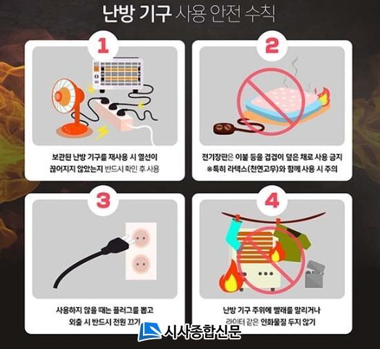 °Ü¿ïöÀº °©ÀÛ½º·± ±â¿Â ±Þ°ÇÏ µî Ãß¿î ³¯¾¾·Î ÀÎÇÏ¿© ½Ã¹ÎµéÀÇ ¿ÜºÎȰµ¿ÀÌ °¨¼ÒÇϰí, ½Ç³»¿¡¼ Ȱµ¿ÇÏ´Â µ¿¾È Àü±âÀåÆÇ°ú È÷ÅÍ µî Àü±â ³¹æ ¿ëǰÀÇ »ç¿ëÀÌ ¸¹¾ÆÁö¸é¼ ÈÀç ¹ß»ý ¿ª½Ã Áõ°¡Çϱ⠶§¹®¿¡ ³¹æ±â±¸ »ç¿ë ½Ã ¾ÈÀü¼öÄ¢ ¼÷Áö°¡ ¹«¾ùº¸´Ù Áß¿äÇÏ´Ù.