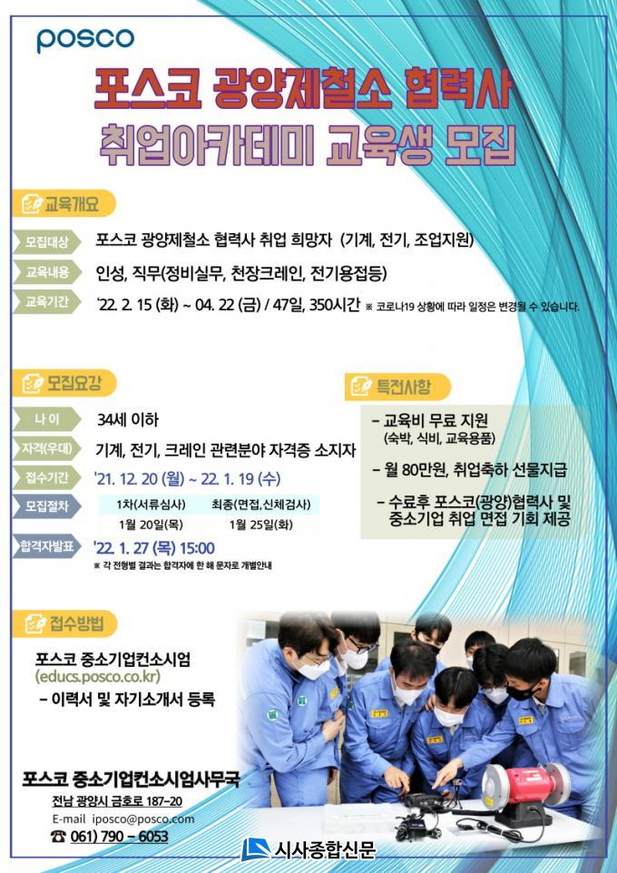Á¢¼ö´Â Æ÷½ºÄÚ Áß¼Ò±â¾÷ÄÁ¼Ò½Ã¾ö ȨÆäÀÌÁö(http://educs.posco.co.kr)¿¡¼ Áö¿ø °¡´ÉÇϸç 1¿ù 20ÀÏ(¸ñ) ¼·ù½É»ç ¹ßÇ¥ ÈÄ, 25ÀÏ(È) ¸éÁ¢ ¹× ½Åü°Ë»ç¸¦ °ÅÃÄ 27ÀÏ(¸ñ) ÃÖÁ¾ ÇÕ°ÝÀÚ¸¦ ¹ßÇ¥ÇÑ´Ù. ÀÚ¼¼ÇÑ »çÇ×Àº Æ÷½ºÄÚ Áß¼Ò±â¾÷ÄÁ¼Ò½Ã¾ö»ç¹«±¹(061-790-6053)À¸·Î ¹®ÀÇÇÏ¸é µÈ´Ù.