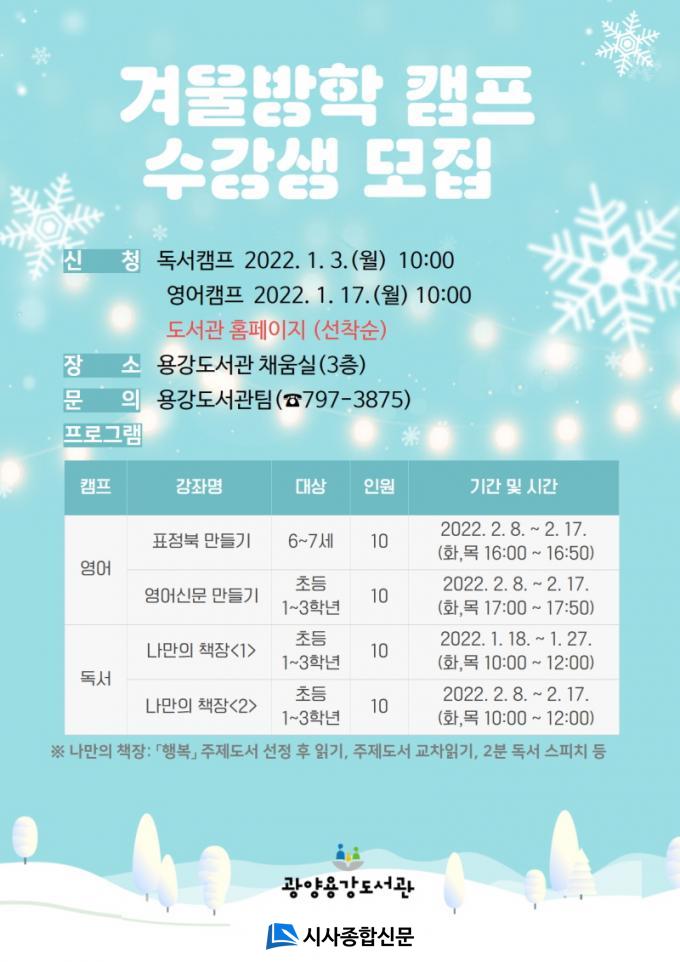 °í±Ù¼º µµ¼°ü¿î¿µ°úÀåÀº ¡°¿ë°µµ¼°üÀº ±×µ¿¾È ¾î¸°À̸¦ ´ë»óÀ¸·Î ÇÑ ¿µ¾î¿Í µ¶¼ ÇÁ·Î±×·¥À» ²ÙÁØÈ÷ ¿î¿µÇØ ¿Ô´Ù¡±¸ç, ¡°À̹ø °Ü¿ï¹æÇÐ Ä·ÇÁ´Â °úÁ¤º°·Î ¼ö° ÀοøÀ» °¢°¢ 10¸íÀ¸·Î Á¦ÇÑÇϱ⠶§¹®¿¡ ¼µÑ·¯ ¼ö° ½ÅÃ»ÇØ¾ß ÇÑ´Ù¡±°í ¸»Çß´Ù.