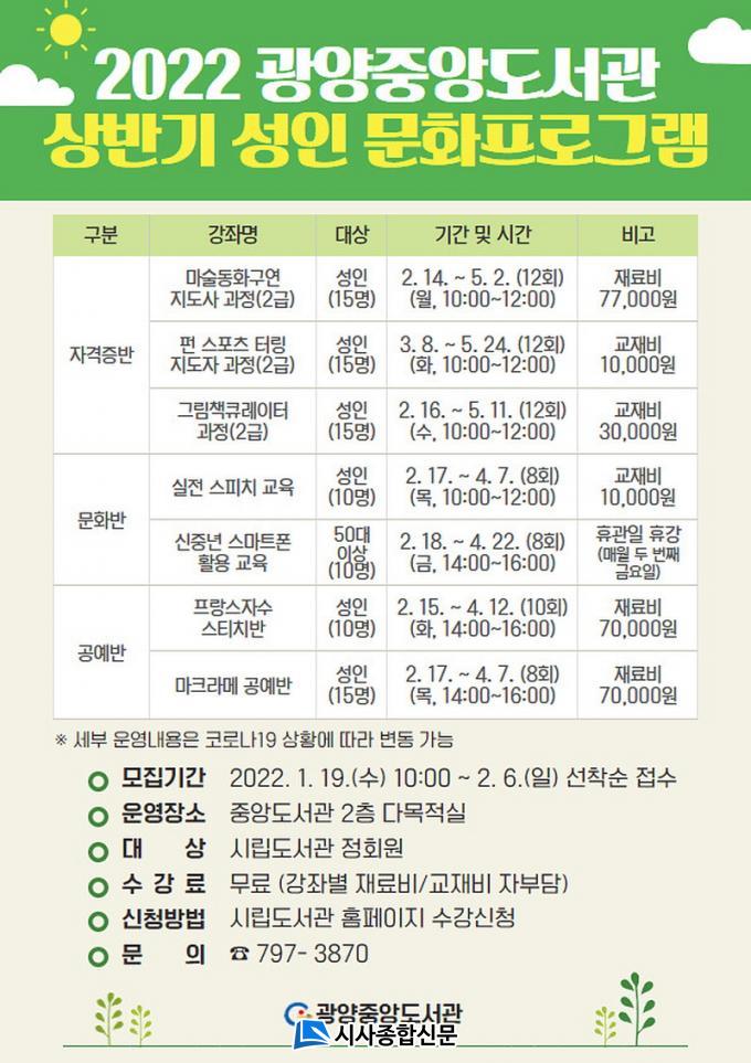 ¹®ÈÇÁ·Î±×·¥ ÀÏÁ¤°ú ³»¿ëÀº ±¤¾ç½Ã¸³µµ¼°ü ȨÆäÀÌÁö(lib.gwangyang.go.kr)¸¦ ¹æ¹®Çϰųª ±¤¾çÁß¾Óµµ¼°ü(¢Ï061-797-3870)À¸·Î ¹®ÀÇÇϸé ÀÚ¼¼È÷ ¾Ë ¼ö ÀÖ´Ù.