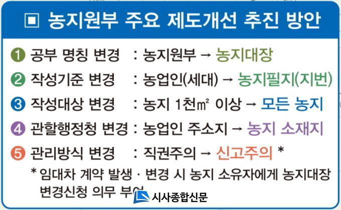 Á¦µµ °³Æí¿¡ µû¶ó ±âÁ¸ ³óÁö¿øºÎ´Â 4¿ù 6ÀϱîÁö¸¸ ¹ß±ÞµÈ´Ù. ³óÁö¿øºÎ´Â ³ó¾÷ÀÎ ¼¼´ëº°·Î ÀÛ¼ºÇßÀ¸³ª ³óÁö´ëÀåÀº ³óÁö ÇÊÁö(Áö¹ø)¸¦ ±âÁØÀ¸·Î ÀÛ¼ºµÈ´Ù. ÀÌ¿Í ÇÔ²² ÀÛ¼º ´ë»óÀº 1000§³¿¡¼ ¸ðµç ³óÁö·Î, °üÇÒ ÇàÁ¤Ã»Àº ³ó¾÷ÀÎ ÁÖ¼ÒÁö¿¡¼ ³óÁö ¼ÒÀçÁö·Î º¯°æµÈ´Ù.