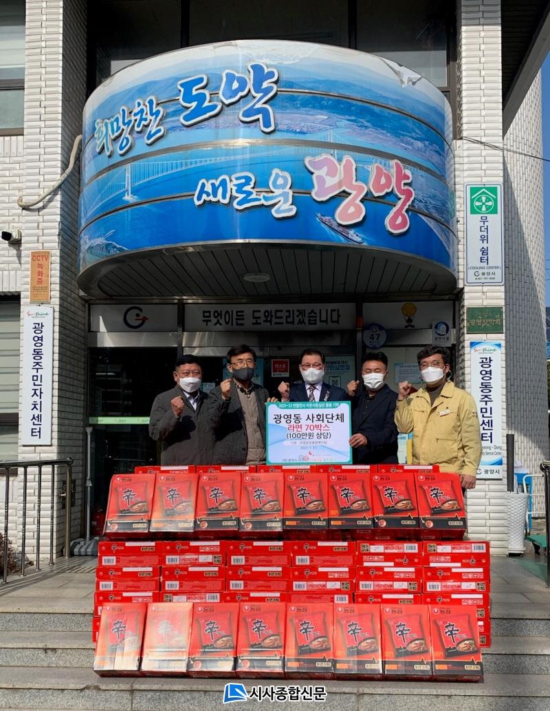 À̳¯ Àü´Þ½Ä¿¡´Â À̱âÁ¾ (Àç)±¤¿µÀåÇÐȸ ÀÌ»çÀå, ±èÀ±¼± ±¤¿µµ¿ ÁÖ¹ÎÀÚÄ¡À§¿øÀå, Á¶Ä¥±Ô ±¤¿µµ¿ »ýȰ¾ÈÀüÇùÀÇȸÀå µî 3°³ ´ÜüÀåÀÌ Âü¿©ÇØ ¶ó¸é 70¹Ú½º(100¸¸ ¿ø »ó´ç)¸¦ ±âºÎÇß´Ù.